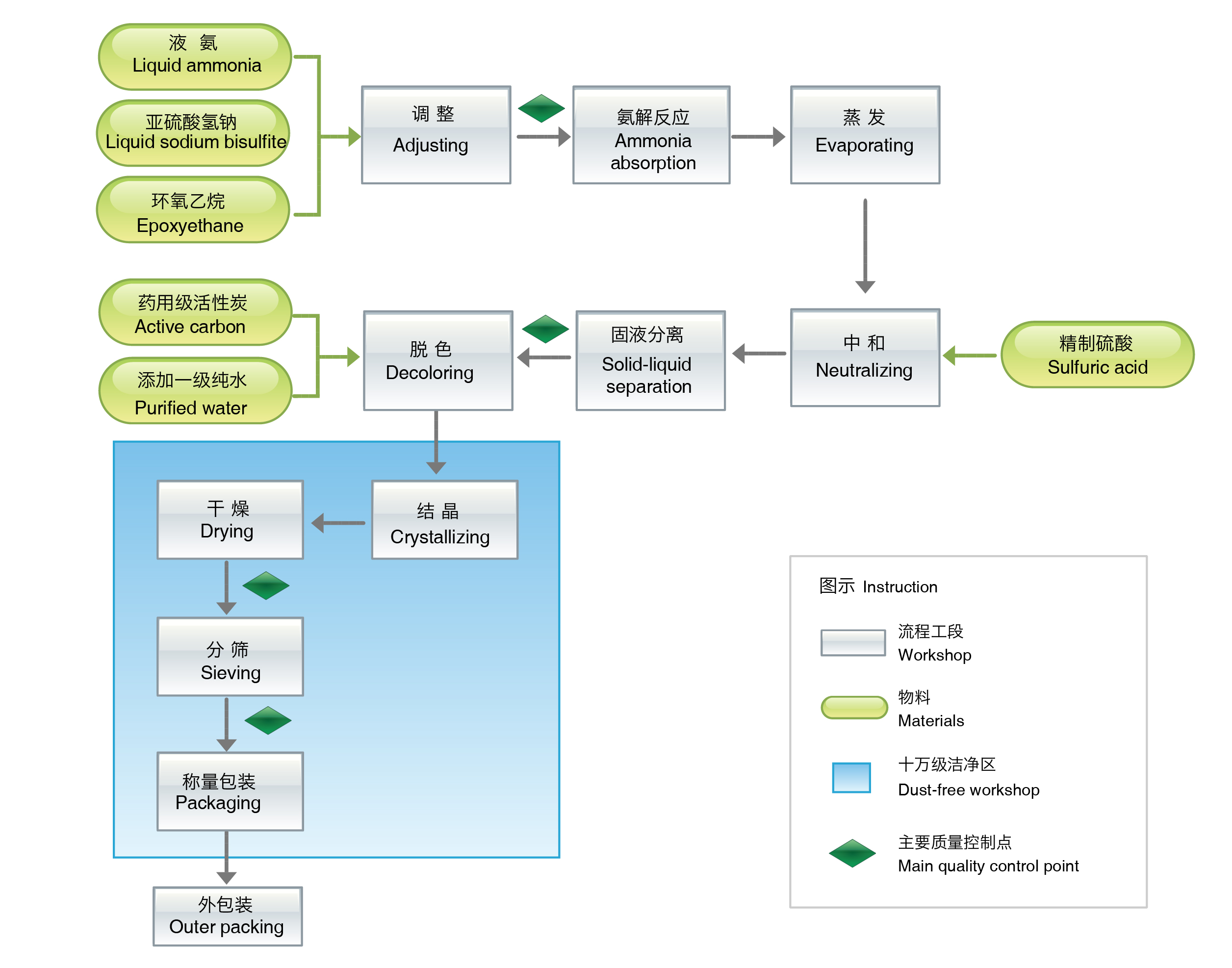 通過引進(jìn)優(yōu)秀的人才、資金和技術(shù),在新生產(chǎn)工藝“環(huán)氧乙烷法”的基礎(chǔ)上,不斷進(jìn)行技術(shù)改良和工藝創(chuàng)新,最終建成了萬噸級?;撬岬纳a(chǎn)規(guī)模。 引進(jìn)先進(jìn)的生產(chǎn)設(shè)備,齊備的精密分析檢測儀器。從原料的采購入廠到最終的產(chǎn)品出庫, 從最小的到最大的生產(chǎn)單位, 所有車間崗位都是在全程監(jiān)控下完成作業(yè)的。 ??